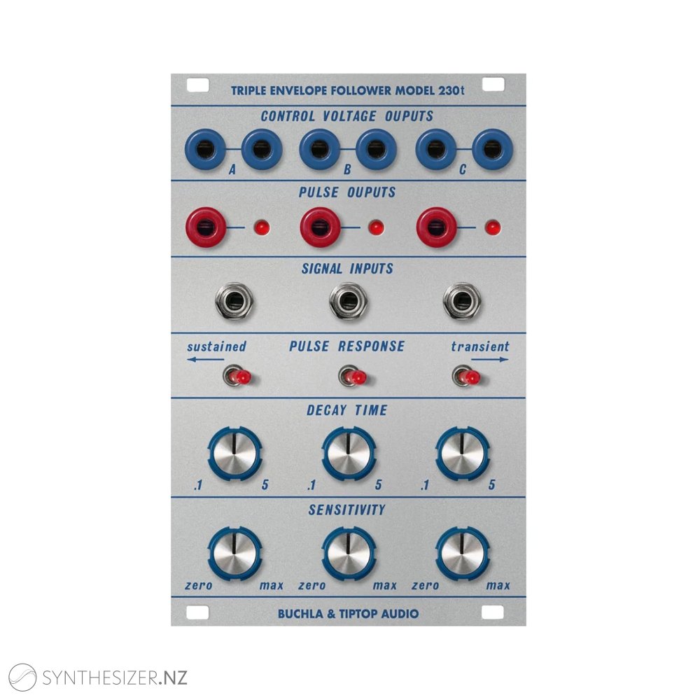 The Buchla Model 230t is a Triple Envelope Follower designed to translate audio signals of any type into smooth control voltages for dynamic patching.