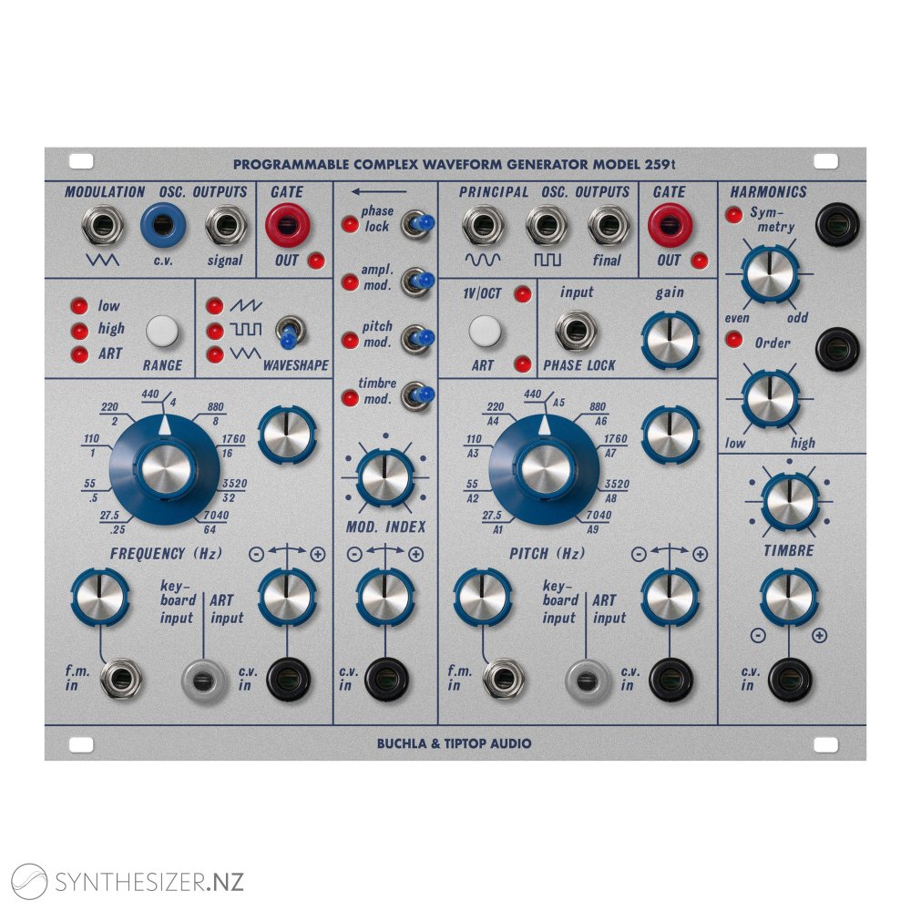 Tiptop Audio’s Buchla 259t Programmable Complex Waveform Generator brings Buchla’s innovative approach to the endless possibilities of Eurorack synths. It features a dual-oscillator design, with a Principal and Modulation oscillator. The Principal oscillator can be tweaked via CV to produce anything from sine and square waves to a huge range of complex waveforms using the Timbre and Harmonics section.