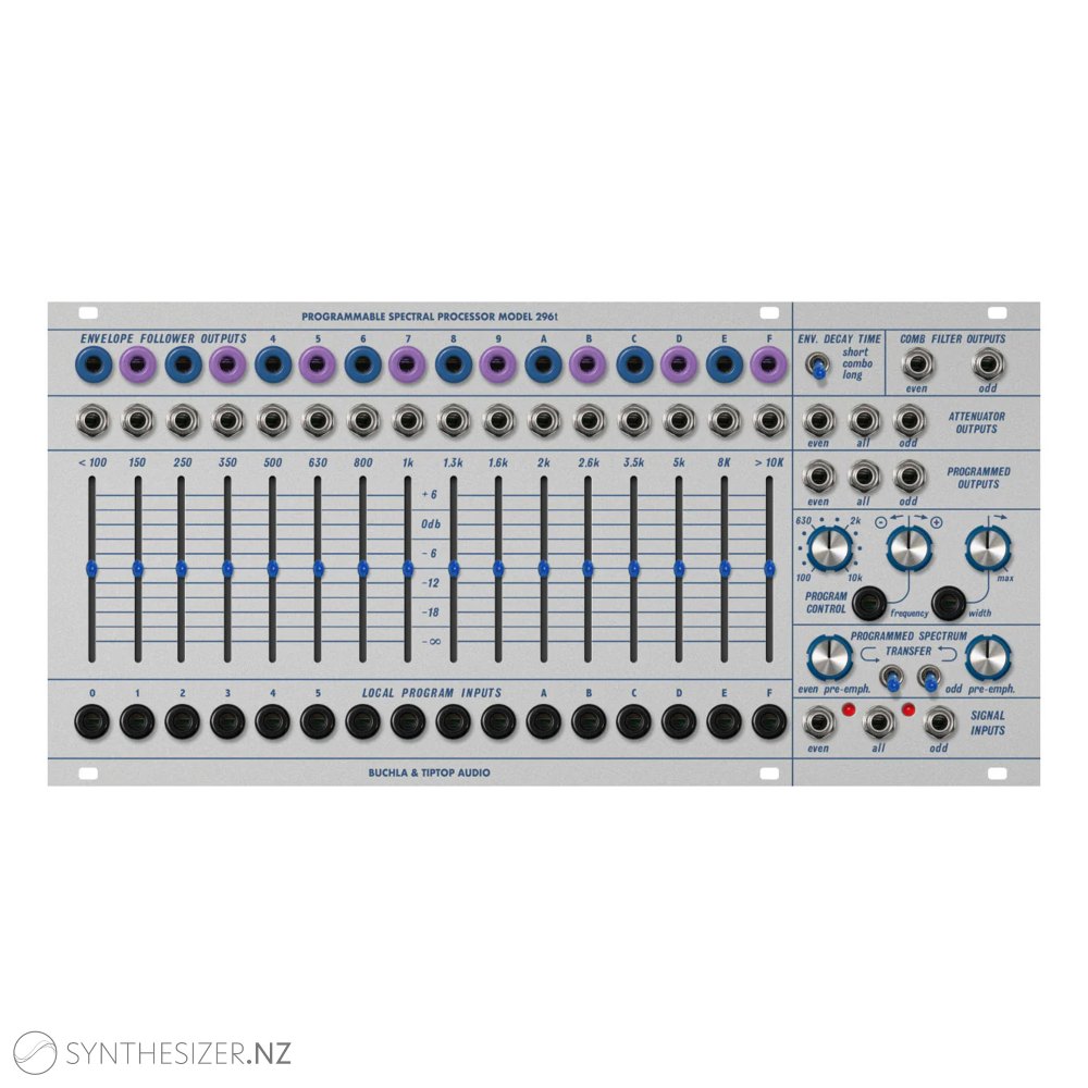 The 296t Programmable Spectral Processor is Tip Top Audio's recreation of the Buchla 296, and provides comb filtering, vocoding, envelope following along with 16 fixed-frequency filters.